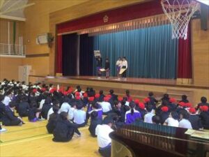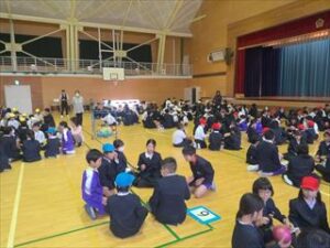 29日、6年生プロジェクト「あいさつチーム」が中心となって、「みんなであいさつにこにこ集会」を行いました。