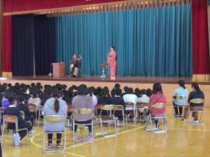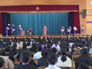 20日(水)、三味線奏者の濱谷さんと歌手の中村さんが来校され、全校児童が参加する三味線鑑賞会を行いました。